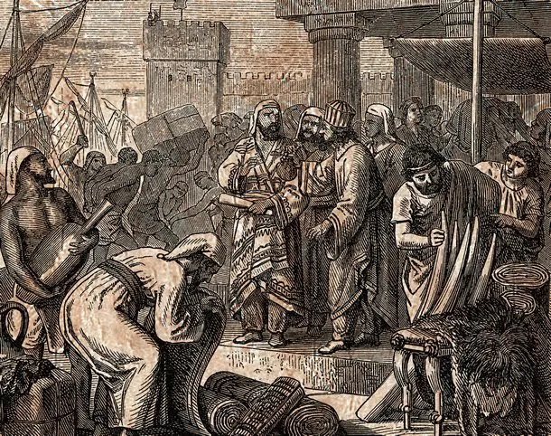 Representação de comerciantes fenícios, os primeiros negociantes da antiguidade